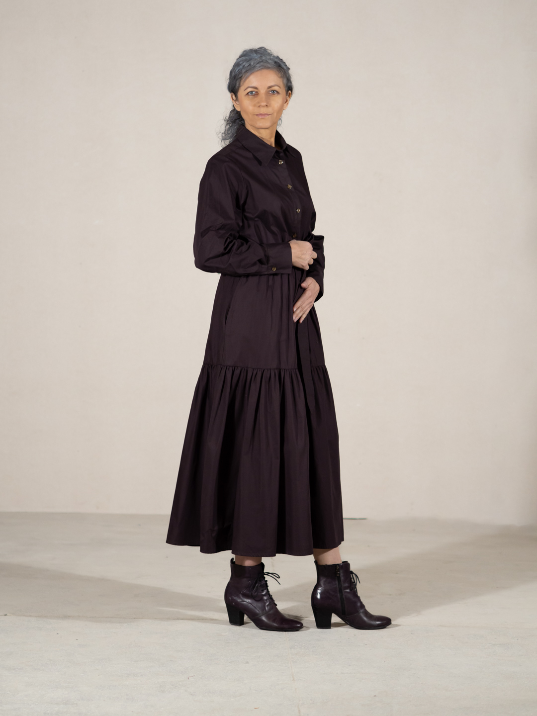 Klasyczna sukienka koszulowa o długości maxi. Minimalistyczna forma zaprojektowana z myślą o komforcie i ponadczasowej elegancji.