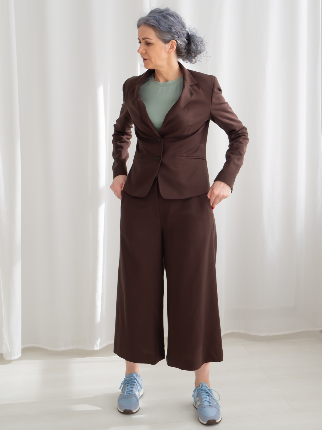 Uniwersalność: Żakiet brązowy Classic Linen pasuje zarówno do lnianych spodni w komplecie, jak i do ulubionych jeansów.